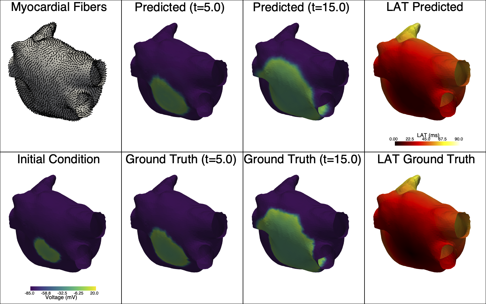 A list of relevant publications on this collaboration is here: it includes works on using deep learning techniques to perform segmentation of the myocardium, of the scarred portion thereof, and to extract clinical features; work on predicting sudden cardiac death from enhanced cardio-MRI images and clinical features; and works developing novel machine learning techniques for solving the electrophysiology equations faster across different domains (the patient-specific hearts), based on deep learning and harmonic analysis on meshes.